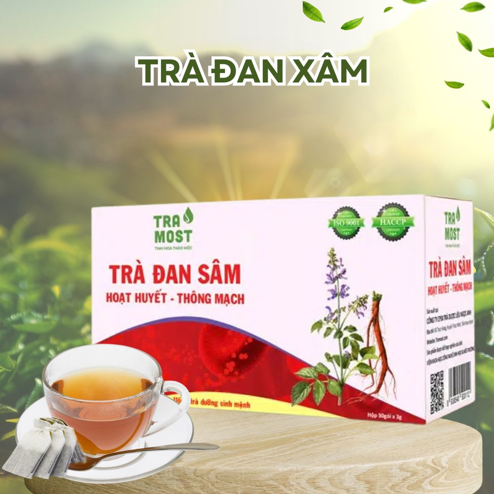 Trà Đan sâm với thành phần chính từ Đan sâm, hoa hòe, lá thành ngạnh, xuyên khung, lá đinh lăng, câu kỉ tử, hạt muồng và nhiều thảo dược quý khác. Theo y học cổ truyền, sản phẩm có tác dụng giúp lưu thông khí huyết, giảm hấp thu chất béo glucose, ngăn ngừa xơ vữa động mạch. Sản phẩm còn giúp giảm cholesterol xấu (LDL) và tăng Cholesterol tốt (HDL), đồng thời tăng cường độ co giãn và bền vững của thành mạch, cao huyết áp và đột quỵ. Ngoài ra, sản phẩm còn giúp giảm căng thẳng, hoa mắt, chóng mặt và các triệu chứng suy nhược cơ thể.